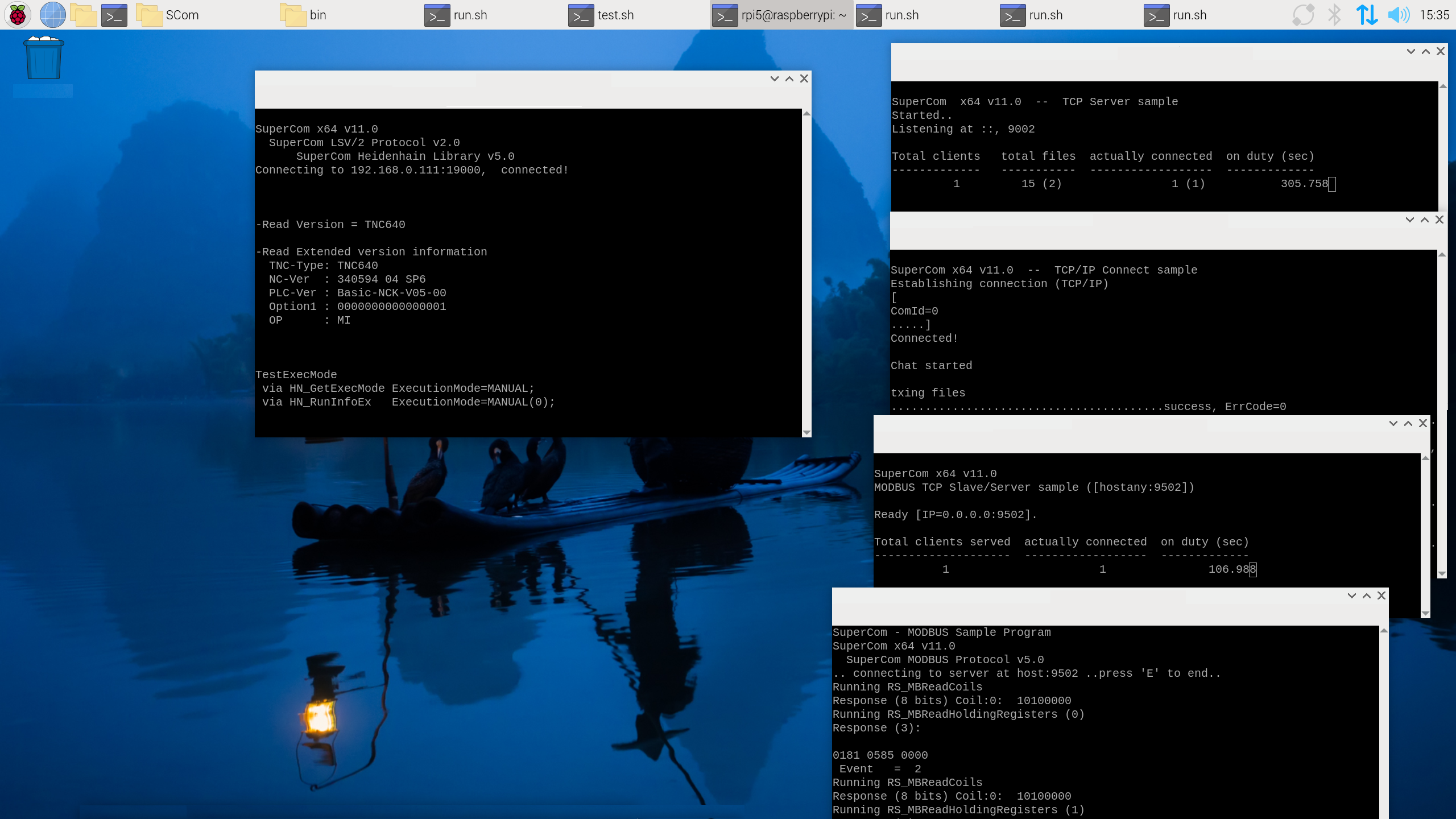Showing SuperCom on Rpi5 64 Bit [Heidenhein, MODBUS, ZMODEM, Client/Server])